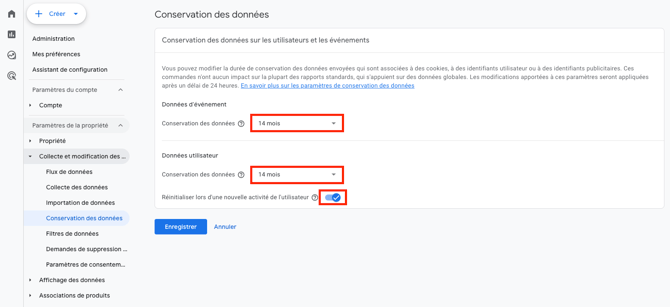Activez l'interrupteur Réinitialiser les données utilisateurs lors d'une nouvelle activité afin de renouveler la période de 14 mois à chaque nouvelle interaction d'un utilisateur.