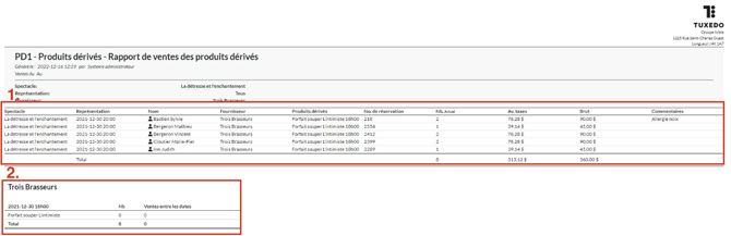Dans le haut du rapport, vous pouvez consulter en détail chacune des réservations du produit dérivé. Ces dernières sont classées par spectacle en fonction des filtres définis plus haut.